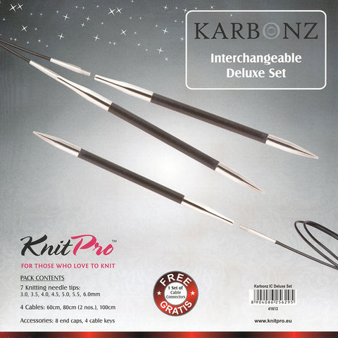 This beautiful deluxe interchangeable needle set contains 3.00, 3.50, 4.00, 4.50, 5.00, 5.50 & 6.00mm interchangeable needles, cables sizes: 60, 80 & 100cm, 8 end caps, 4 cable keys and packaged within a black & grey fabric case.